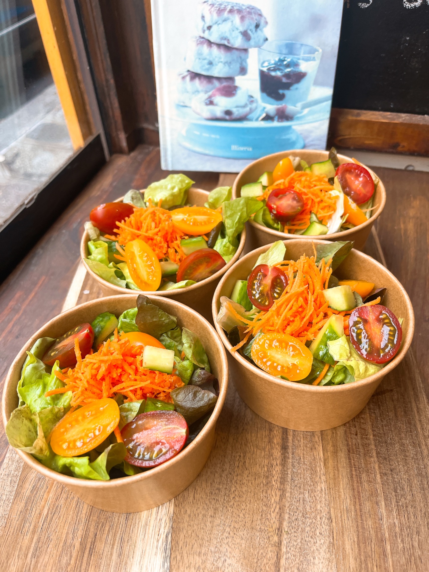 Lot de 4 salades vertes et crudités en format individuel servis avec une vinaigrette balsamique