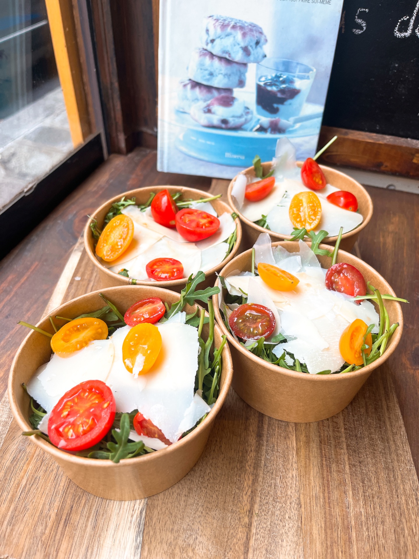 Lot de 4 salades Roquette parmesan et tomates cerises en format individuel servis avec une vinaigrette balsamique